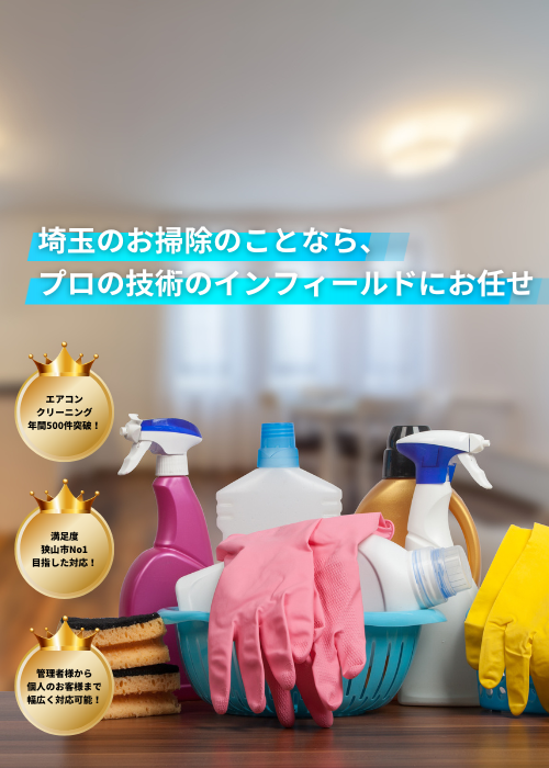 お茶香るまち埼玉狭山市のハウスクリーニングインフィールドです! 一般のお客様のご自宅の水周りのお掃除、賃貸物件の空室清掃、各種エアコンの分解高圧清掃まで、お掃除のことなら当社にお任せください。